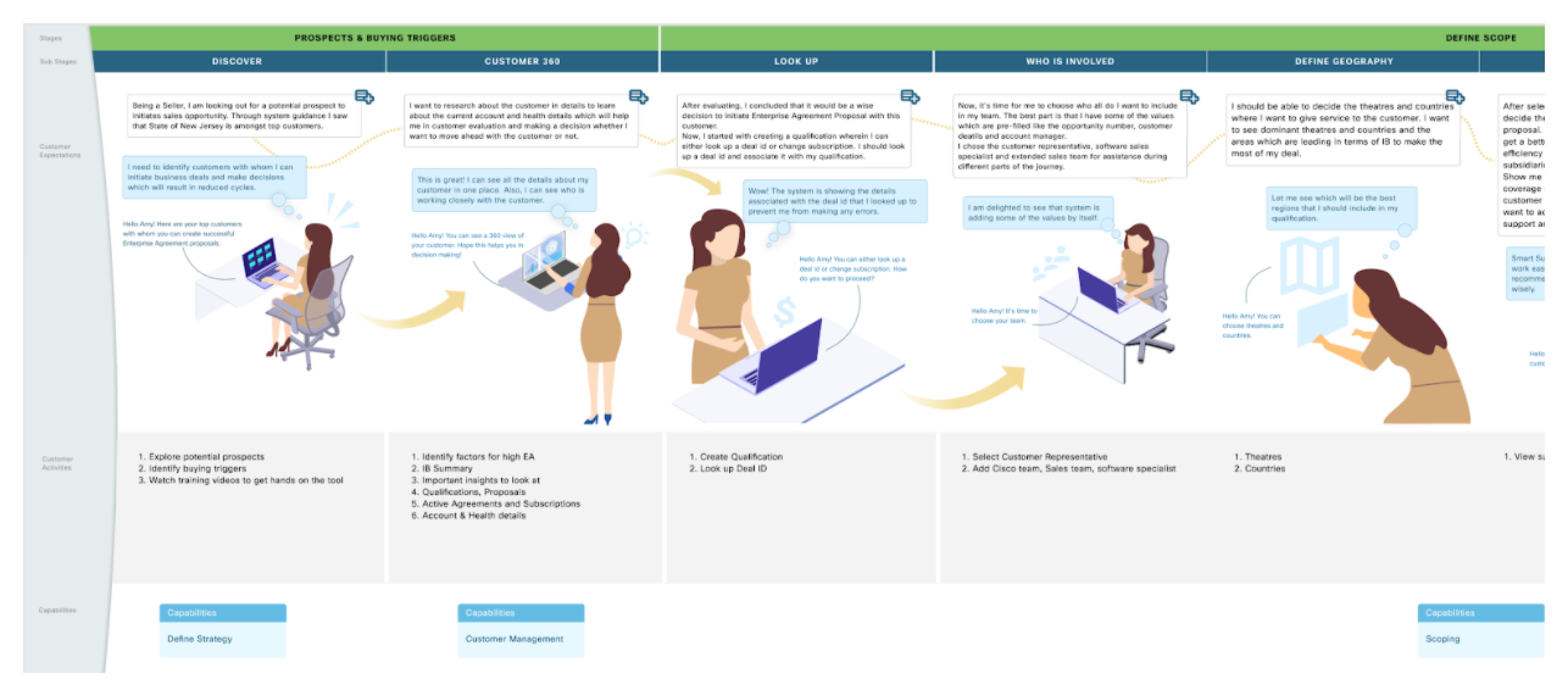 Customer Journey mapping combines storytelling and visualization to create a holistic view of customer experience/ interaction with a product or service in order to accomplish a specific goal. It is used for understanding and addressing customer needs and pain points